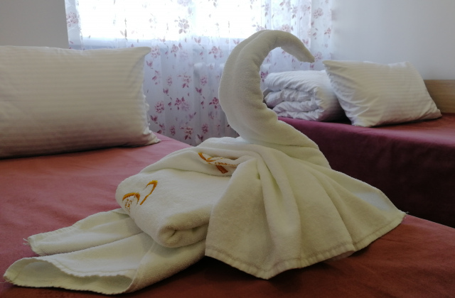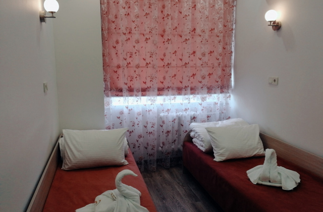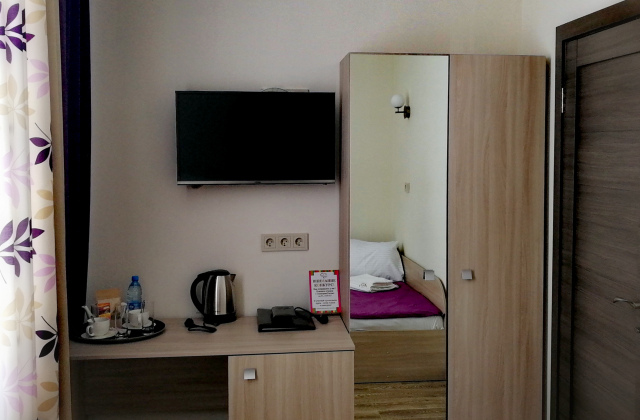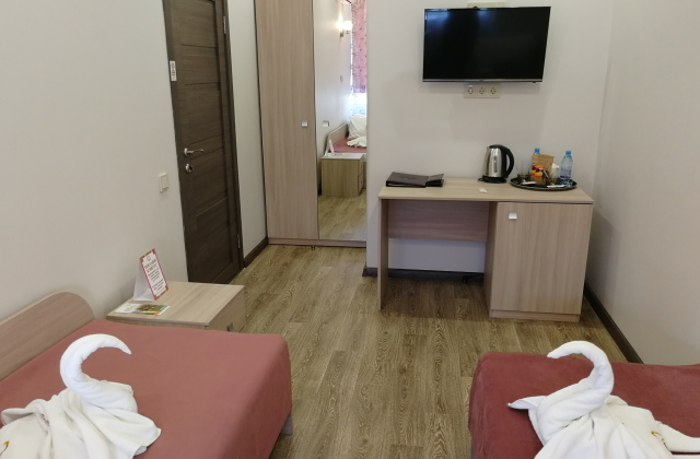 Площадь номера - 16 кв.м. 2 осн. места. 1 доп. место. Мебель: кровати односпальные, прикроватные тумбочки, стол, тумба багажная, шкаф. Оборудование: кондиционер, телевизор, телефон, холодильник, чайный набор посуды, электрочайник. Санузел: тапочки, туалетные принадлежности, фен, халат. Санузел на блок. Сервис: Wi-Fi бесплатно, смена полотенец, смена постельного белья, уборка номера.