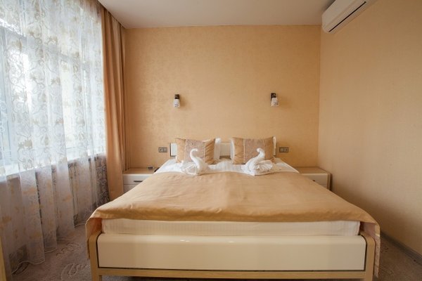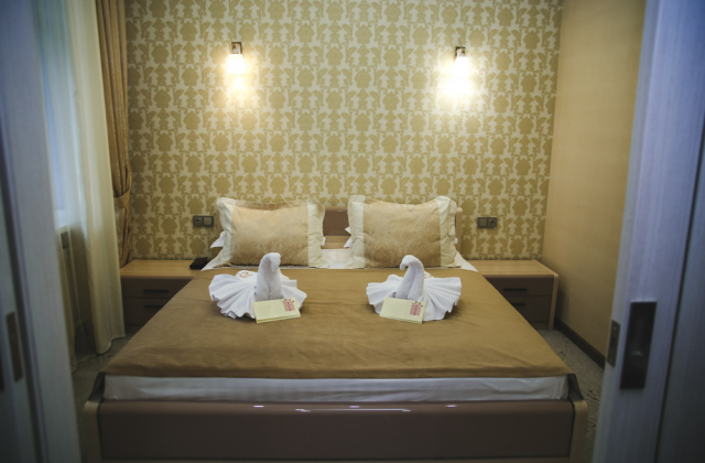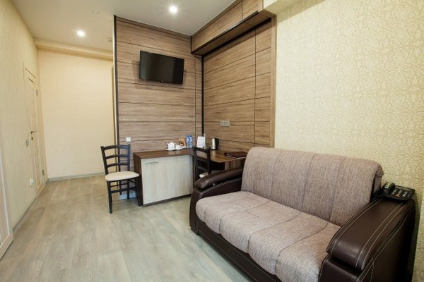 Площадь номера - 35 кв.м. 2 осн. места. 2 доп. места. Мебель: диван, кровать двуспальная, прикроватные тумбочки, стол, стул, шкаф. Оборудование: кондиционер, сейф, телевизор, холодильник, чайный набор посуды. Санузел: с ванной, тапочки, туалетные принадлежности, халат. Сервис: Wi-Fi бесплатно, смена полотенец, смена постельного белья, уборка номера.