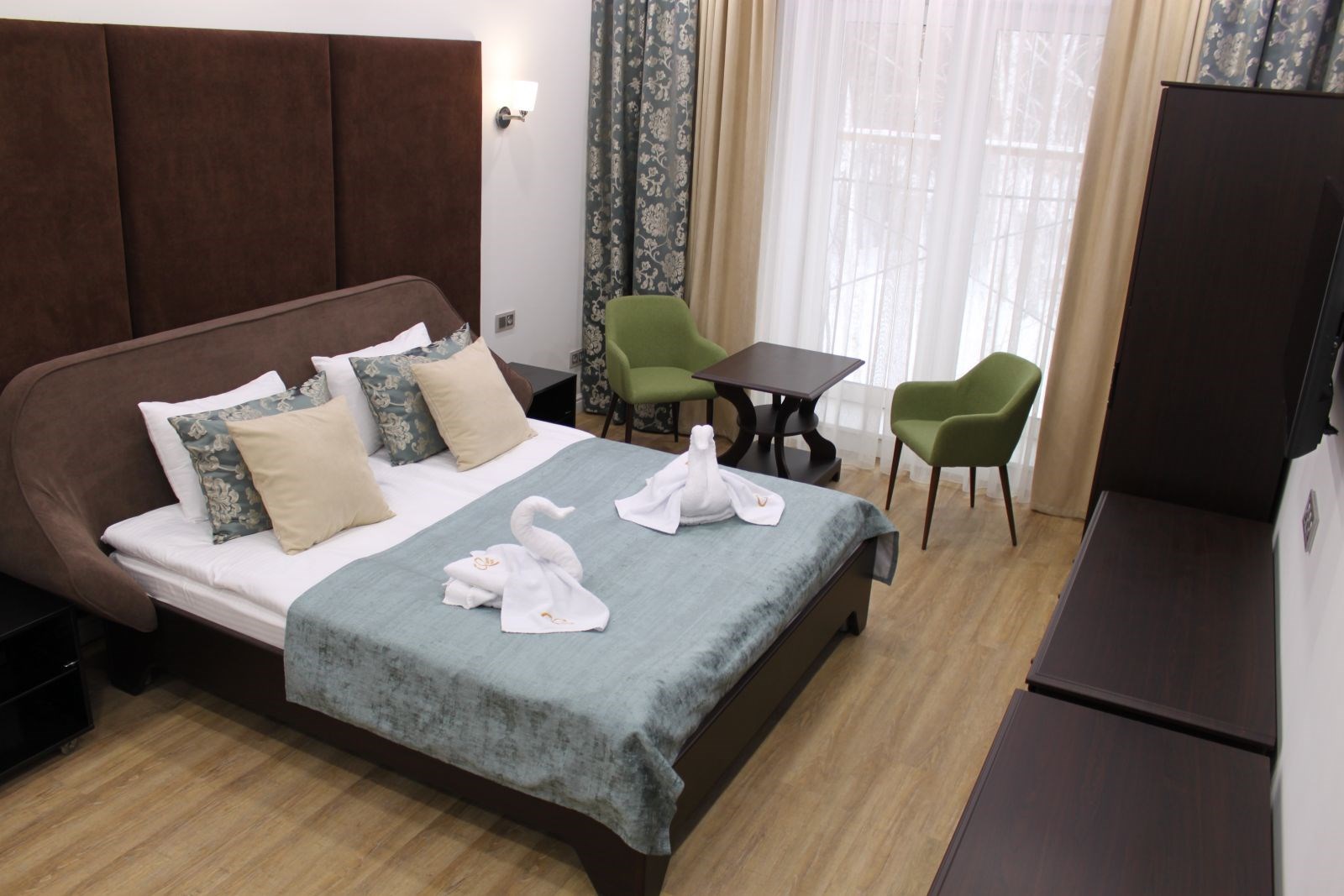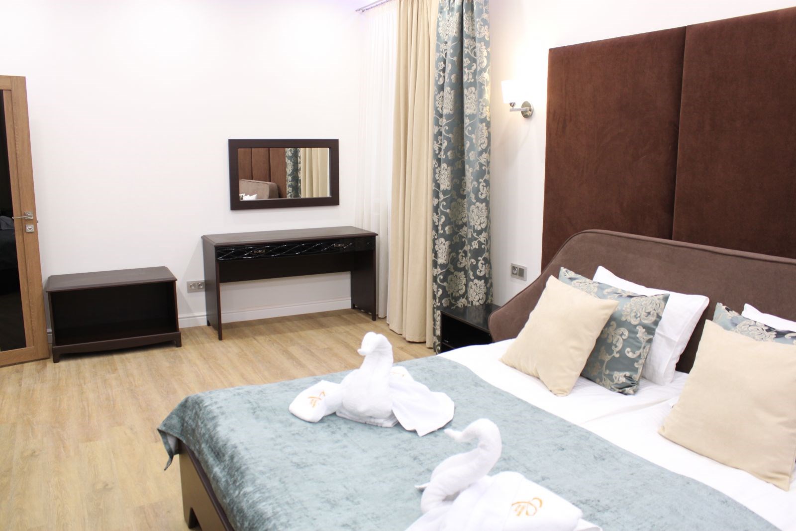 Площадь номера - 48 кв.м. 2 осн. места. 2 доп. места. Мебель: диван раскладной, кровать двуспальная, прикроватные тумбочки, стол, стул, шкаф. Оборудование: гладильная доска, кондиционер, набор посуды, сейф, телевизор, утюг, холодильник, чайный набор посуды, электрочайник. Санузел: с джакузи, тапочки, туалетные принадлежности, фен, халат. Сервис: Wi-Fi бесплатно, смена полотенец, смена постельного белья, уборка номера.