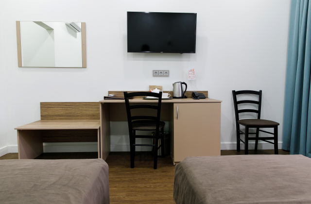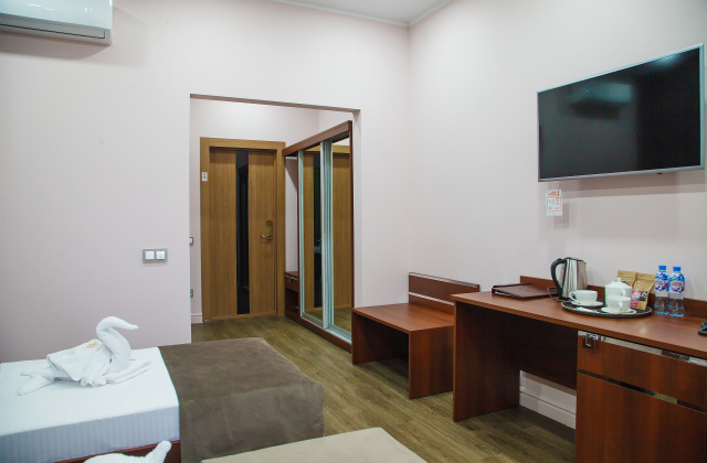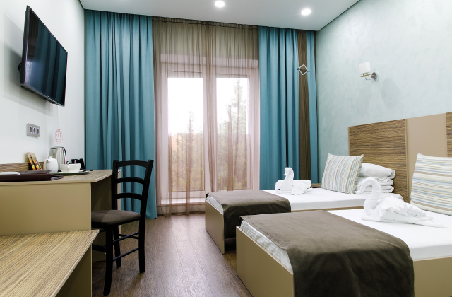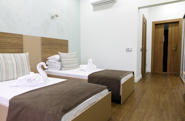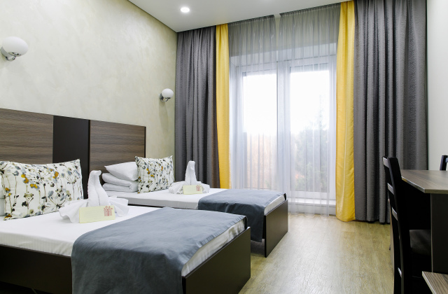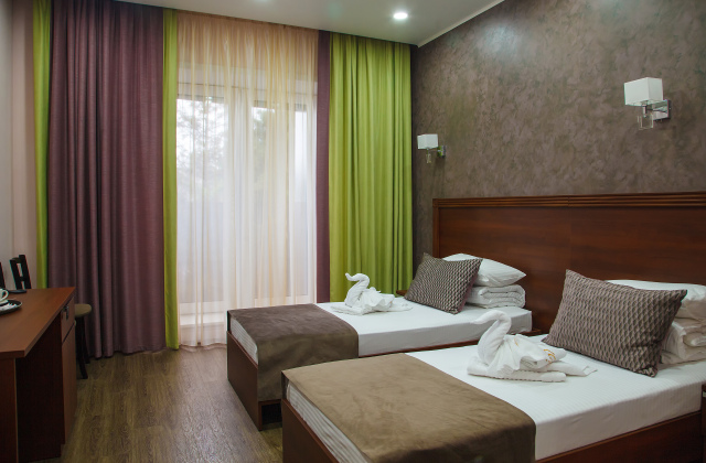 Площадь номера - 22 кв.м. 2 осн. места. Мебель: кровати односпальные, прикроватные тумбочки, стол, стулья, шкаф. Оборудование: кондиционер, сейф, телевизор, холодильник, чайный набор посуды. Санузел: с душем, тапочки, туалетные принадлежности, халат. Сервис: Wi-Fi бесплатно, смена полотенец, смена постельного белья, уборка номера.