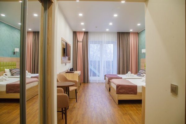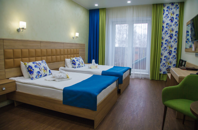 Площадь номера - 31 кв.м. 2 осн. места. 1 доп. место. Мебель: кровати односпальные, прикроватные тумбочки, стол, стулья, шкаф. Оборудование: кондиционер, сейф, телевизор, холодильник, чайный набор посуды. Санузел: с душем, тапочки, туалетные принадлежности, халат. Сервис: Wi-Fi бесплатно, смена полотенец, смена постельного белья, уборка номера.